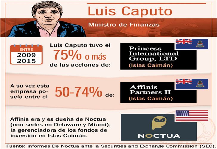 La participación accionaria de Caputo en estas offshores vuelve a exponer un posible conflicto de intereses. Noctua se dedica a administrar fondos de inversión de alto riesgo en Caimán, donde impera el oscurantismo financiero. Hasta seis meses antes de asumir en el gabinete de Mauricio Macri en diciembre de 2015, Caputo tenía un rol central, como accionista y administrador de estas inversiones secretas, que incluyeron bonos de la deuda argentina en default. Luego, en 2016, Caputo estuvo a cargo de la negociación con los fondos buitre que reclamaban el pago de los bonos de la deuda argentina en default.